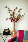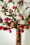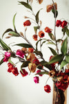 Slank en rank is dit boeket van satijnen bloemetjes in warme tinten rood, die luchtig uitwaaieren. Dit zijden bloemenarrangement heeft de uitstraling van een ingetogen stilleven. Slanke takken waaieren luchtig uit, met bloemen in warme tinten rood, oudroze en goudbruin.